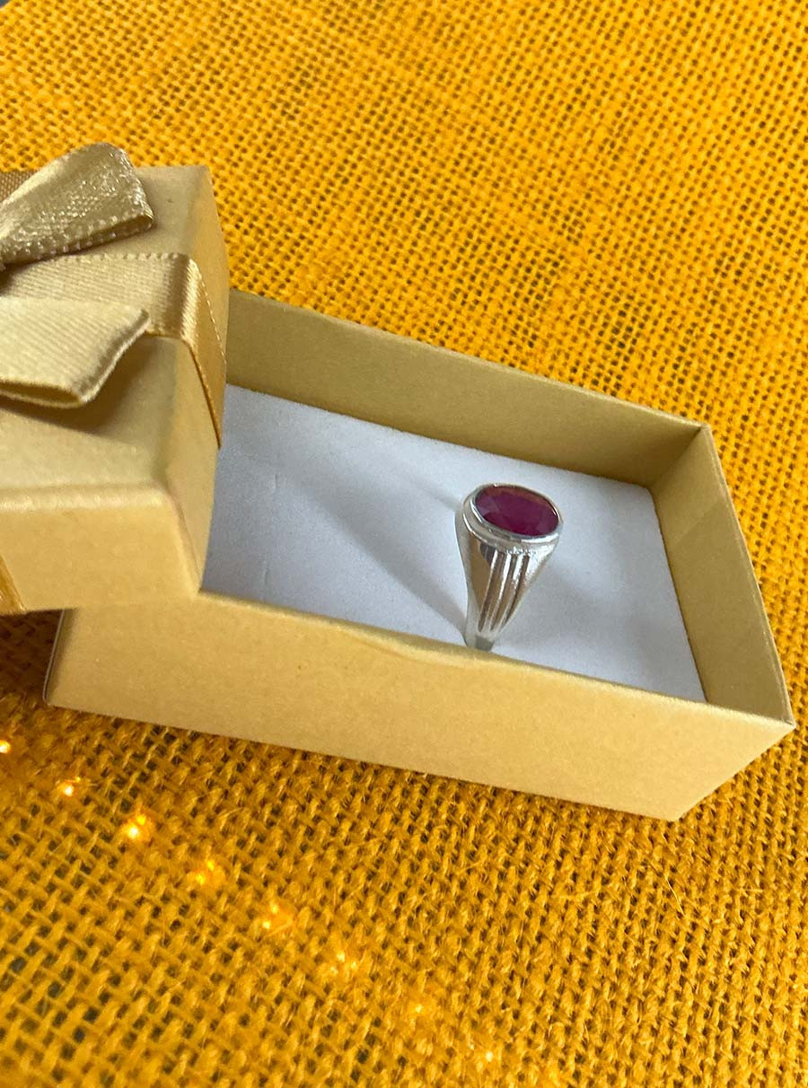The Ruby Silver Ring is a striking and powerful piece of jewelry, featuring a natural ruby gemstone (Manik) set in high-quality sterling silver. Known as the gemstone of the Sun in Vedic astrology, ruby is believed to enhance confidence, vitality, and leadership qualities. Its vibrant red hue adds elegance while radiating positive energy, making it ideal for daily wear or special occasions.