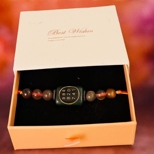 This elegant Numerology Healing Rakhi Bracelet is designed for spiritual protection, positivity, and luck. The centerpiece features a beautifully engraved lucky number combination (868 520 741) that resonates with numerological energy, supported by a combination of grounding and healing beads like Tiger Eye and Labradorite. Ideal for gifting your brother on Raksha Bandhan, this Rakhi is more than a symbol of love—it's a talisman of blessings, strength, and good fortune.