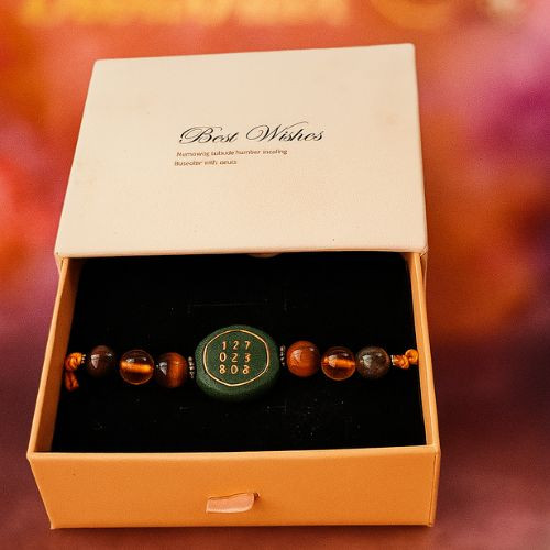 This Lucky Number Numerology Rakhi features the powerful number sequence 127 023 808 engraved on a central bead, surrounded by a harmonious combination of Tiger Eye and grounding healing stones. Thoughtfully handcrafted, this Rakhi blends Vedic numerology with crystal healing to invite abundance, clarity, and protective energy. An ideal Raksha Bandhan gift to strengthen the sibling bond while offering spiritual well-being and timeless elegance.